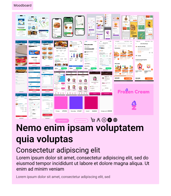Developed as an independent design exercise, FrozenCream is a concept aimed at elevating the digital experience of ordering and browsing artisanal frozen desserts. The project began with moodboard research and sketching wireframes to explore aesthetics and layout, followed by scalable wireframes of increasing fidelity. The end result was a Figma prototype that simulated ordering flows and visual delight—providing a tangible vision for future usability testing and client presentations. The methodology used in this project was Design Thinking.