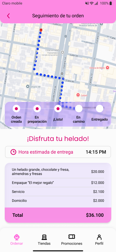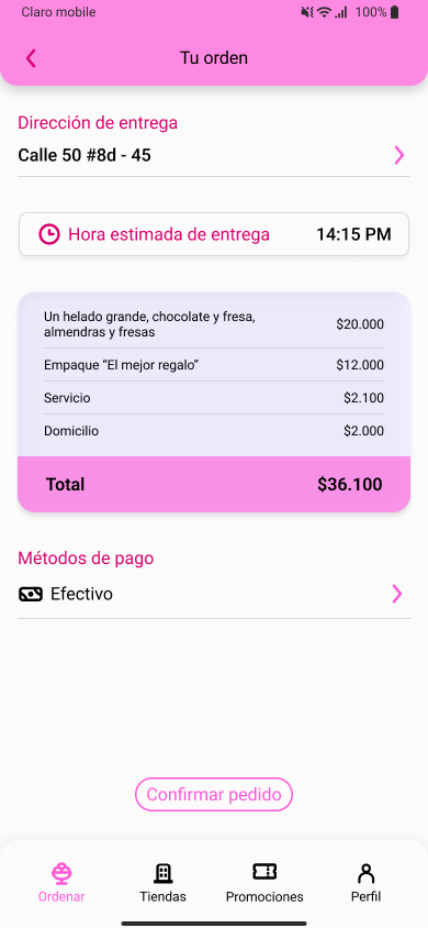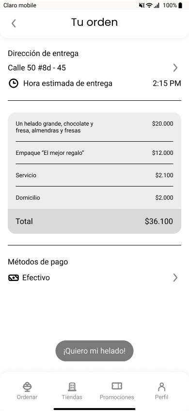 | Payment Process | At checkout, the ice cream price is highlighted, with an option to enter a coupon. A breakdown of all charges is shown. Then, the payment method is selected. | The purchase summary is shown, and the payment method is chosen (credit/debit card, cash, or Rappi points). | The purchase summary is shown, address confirmed, and payment method selected (credit/debit card, cash). | The purchase summary is shown, and the payment method is chosen (credit/debit card, cash). |